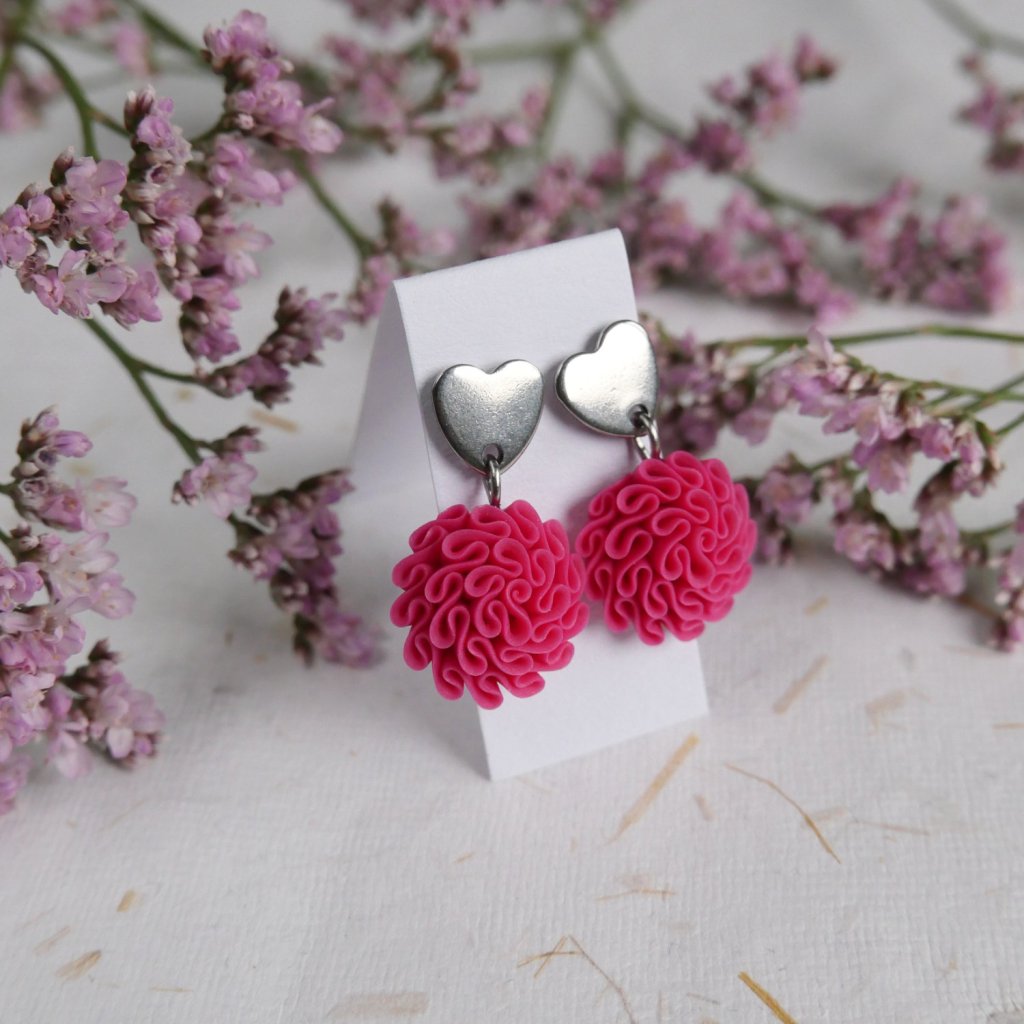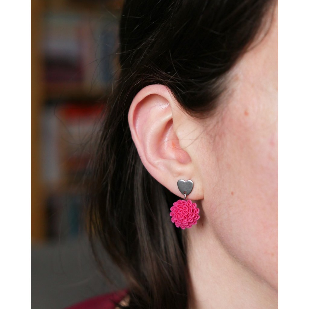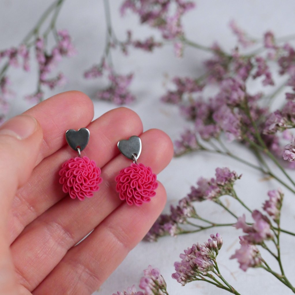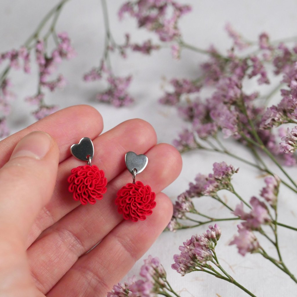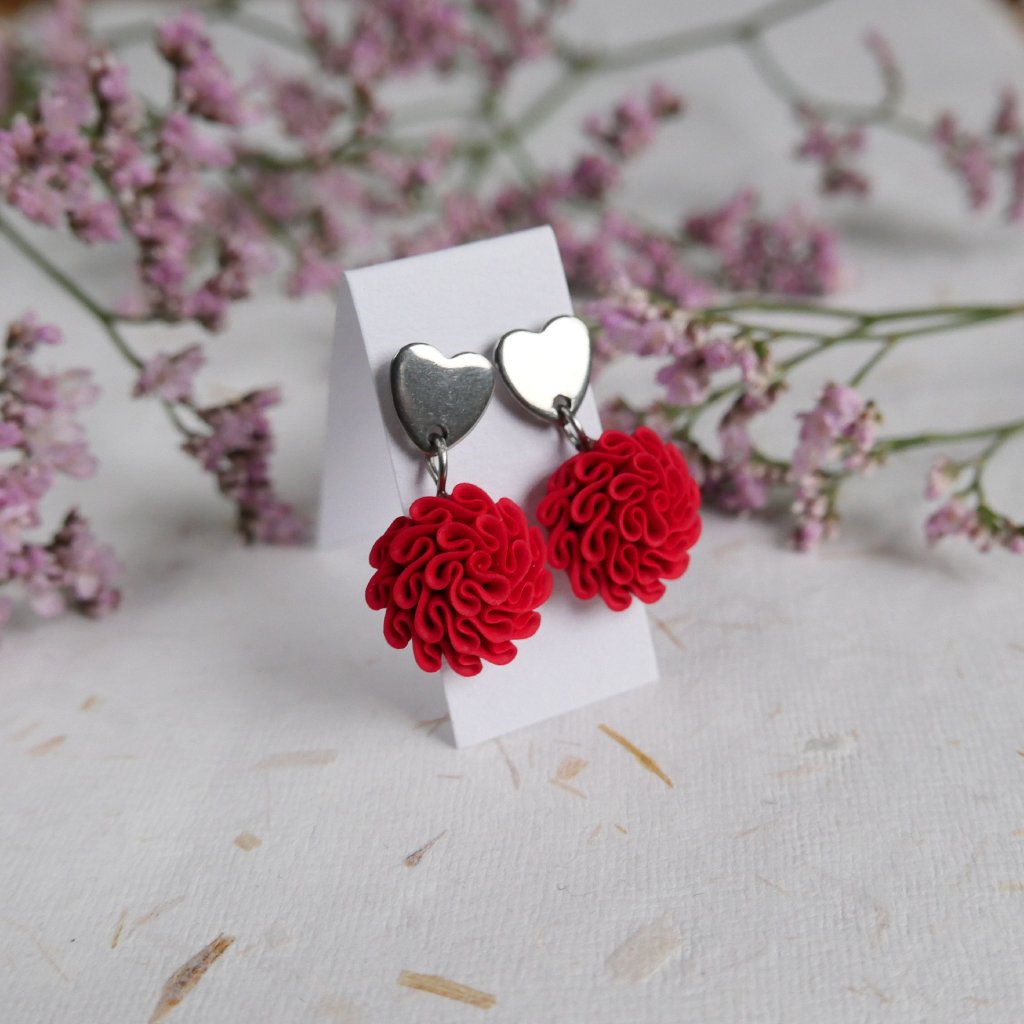 Autorské, ručně modelované náušnice ve tvaru kvítků zavěšené na speciálním srdíčkovém komponentu z chirurgické oceli.